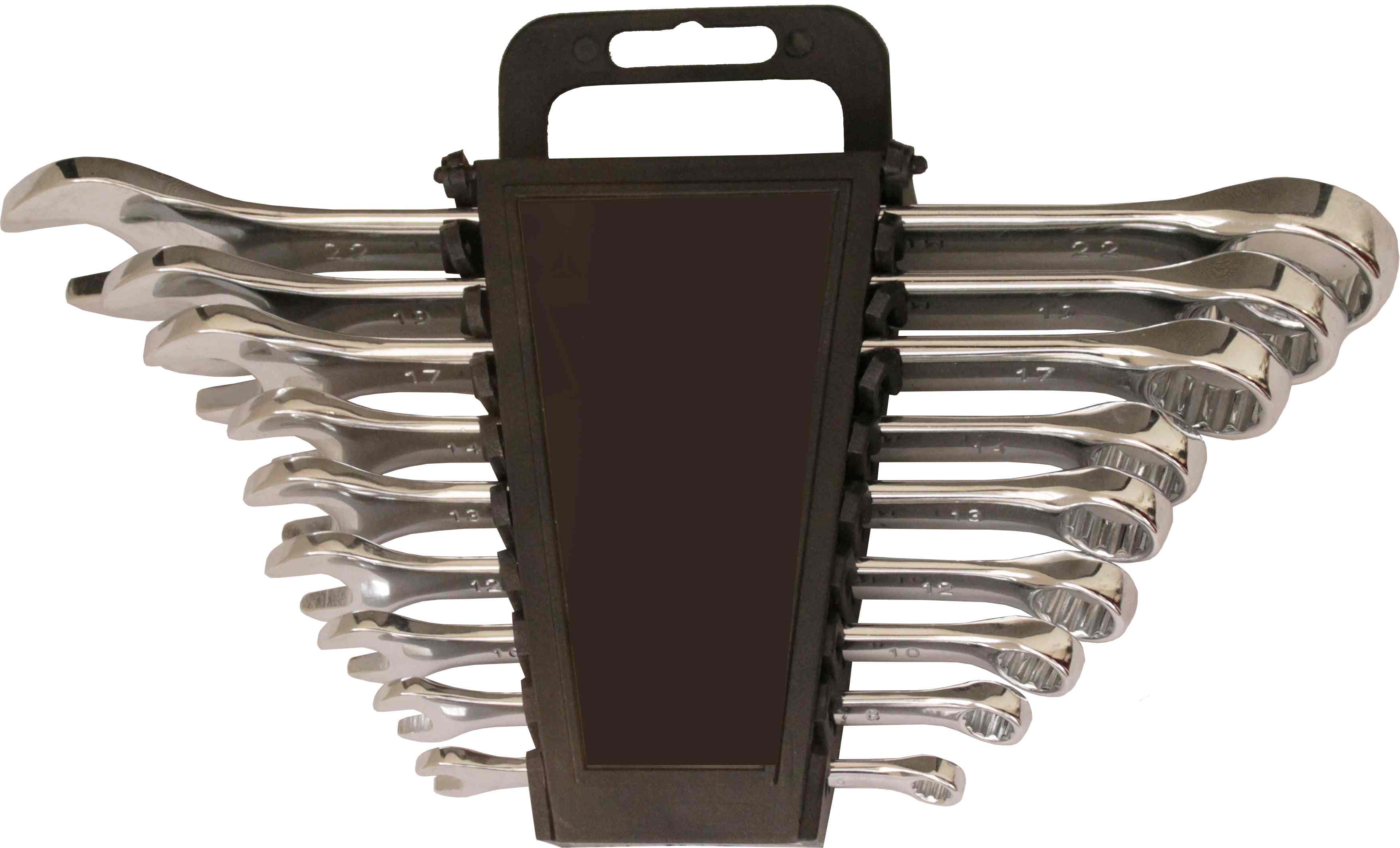 Комбинированный ключ полированный с хромированным покрытием — на одном конце тела расположен рожковый ключ, на другом — накидной. Оба имеют одинаковый размер. Материал: Хромванадиевая сталь."
