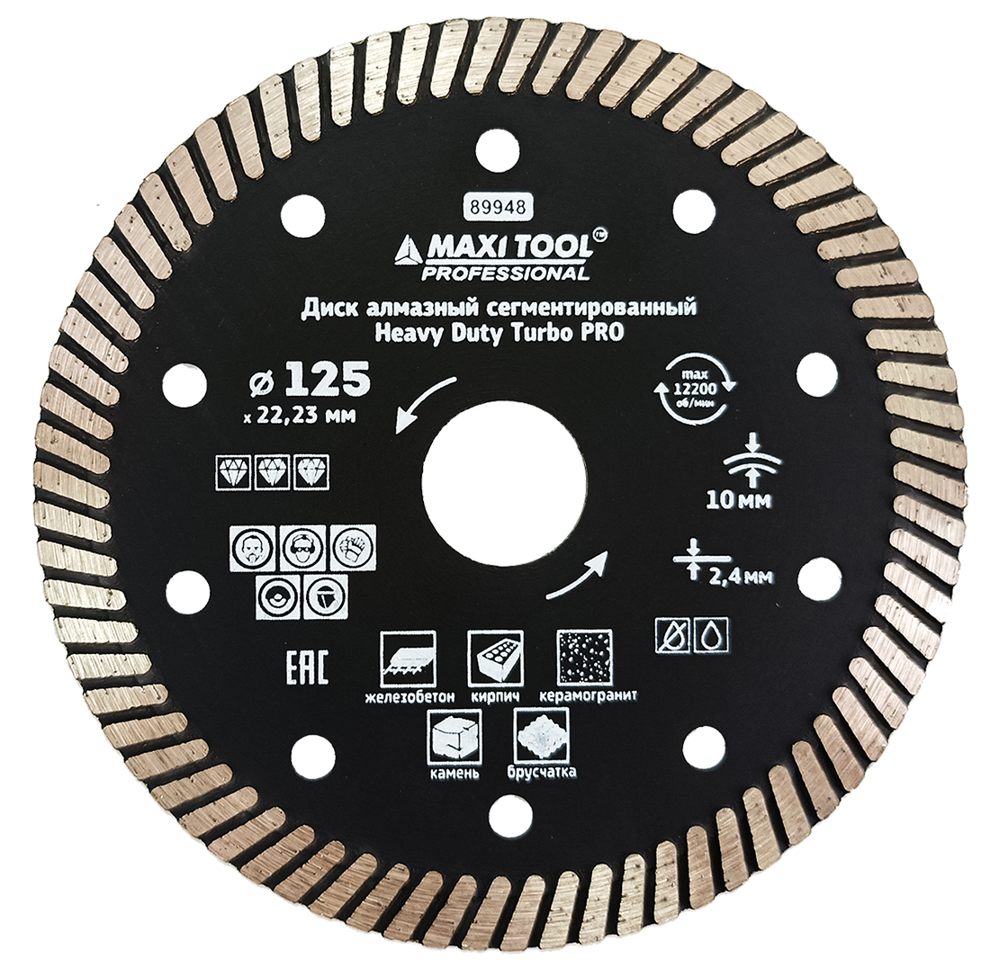 Толщина режущей алмазной кромки 2,2 мм. Высота алмазного слоя 10 мм. Посадочный диаметр 22.23 мм. Максимальная скорость вращения 12200 об/мин. Обладает высокой скоростью реза неармированных материалов средней твердости. Не требуют водяного охлаждения. Турбированная рабочая поверхность диска позволяет проводить резку без водяного охлаждения. Рекомендуется для бытового и профессионального использования.