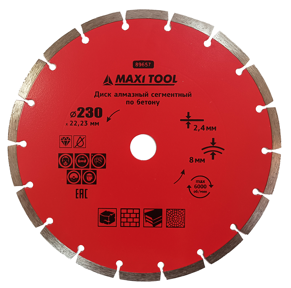Произведен по технологии спекания алмазов под давлением (холодное пресование). Толщина режущей алмазной кромки 2.4 мм. Высота алмазного слоя 8 мм. Посадочный диаметр 22.23 мм. Максимальная скорость вращения 12200 об/мин. Обладает высокой скоростью реза неармированных материалов средней твердости. Не требуют водяного охлаждения. Турбированная рабочая поверхность диска позволяет проводить резку без водяного охлаждения. Рекомендуется для бытового и профессионального использования.