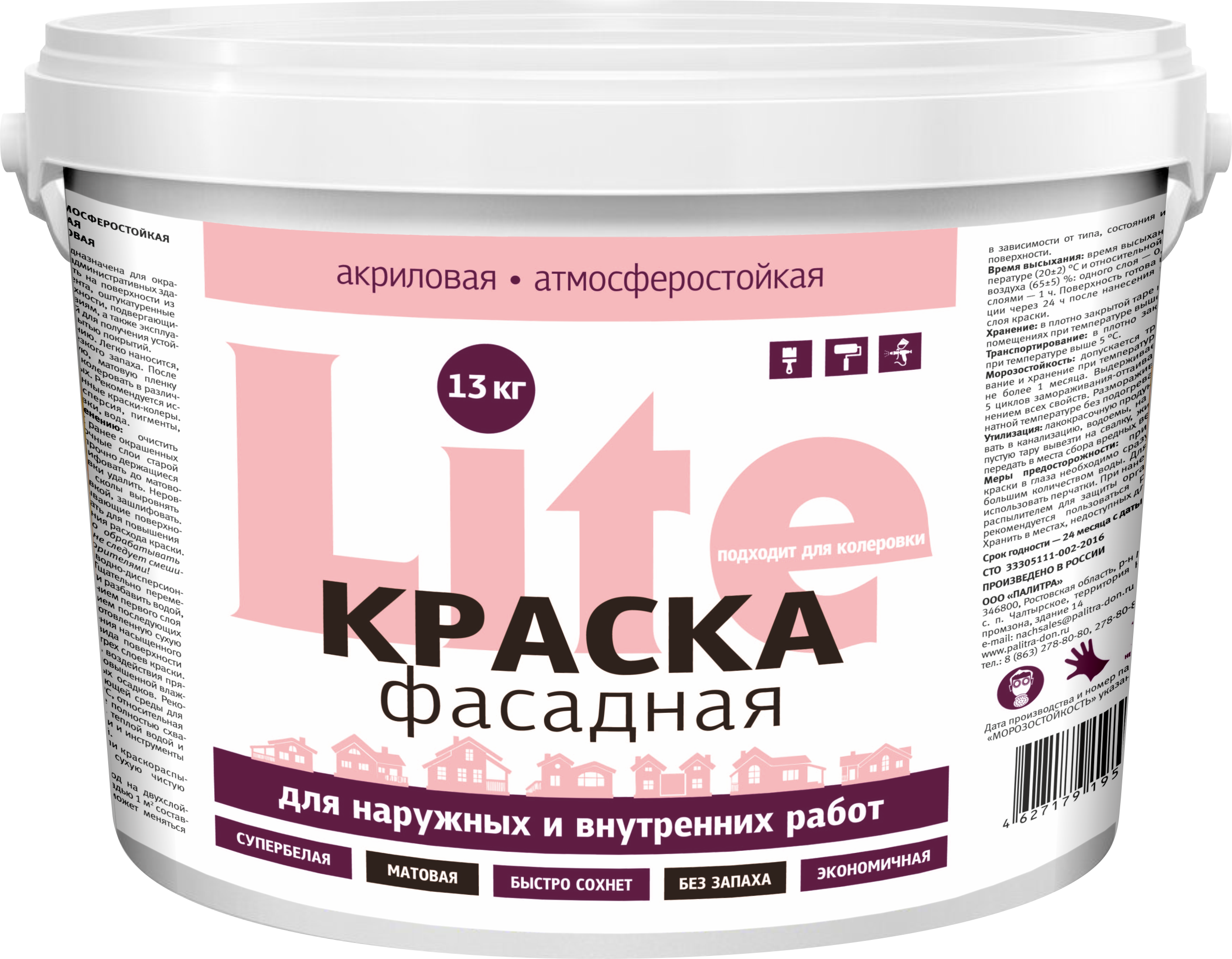 Готова к применению. Легко наносится, быстро сохнет, не имеет резкого запаха. После высыхания образует ровную, матовую пленку белого цвета.