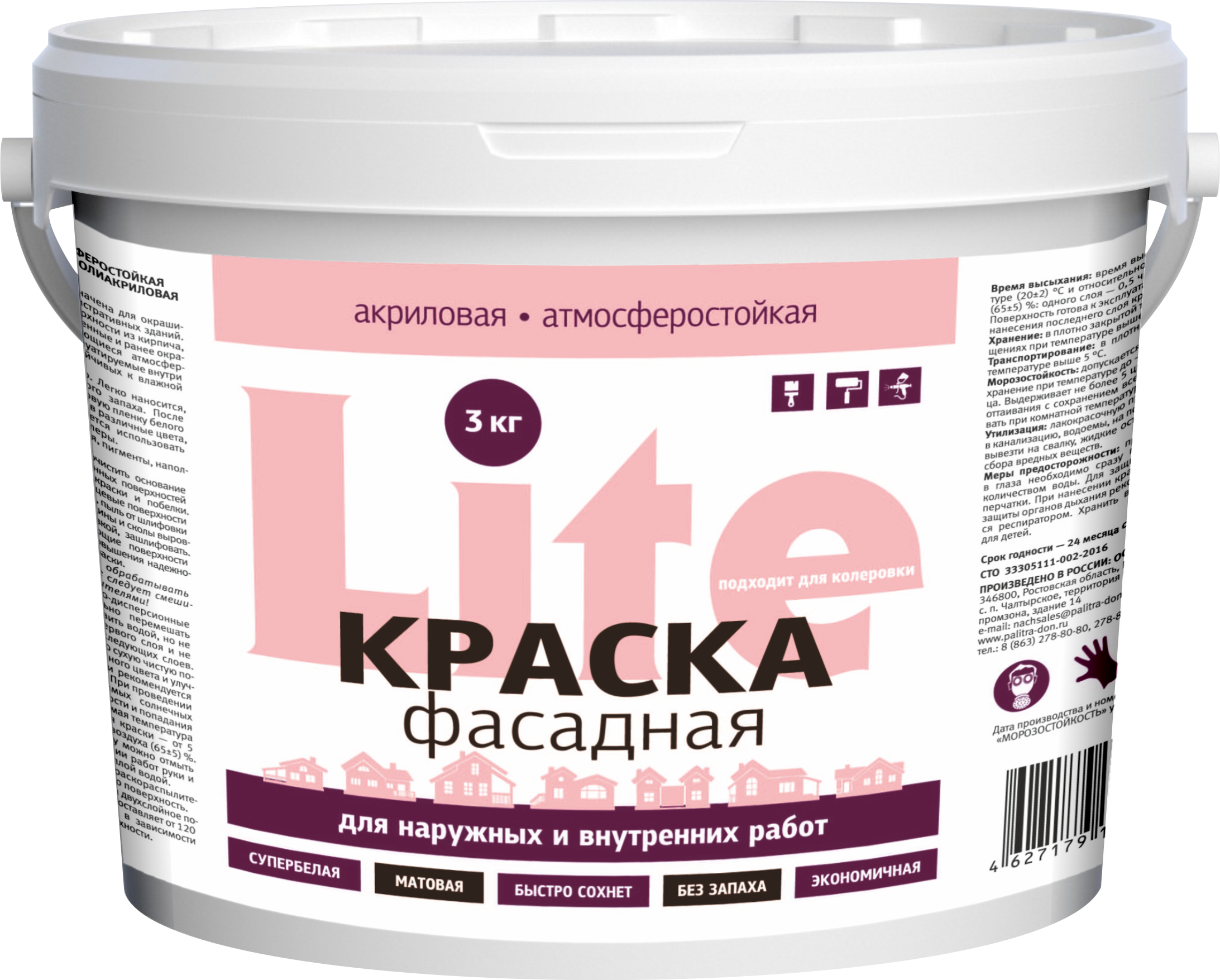 Готова к применению. Легко наносится, быстро сохнет, не имеет резкого запаха. После высыхания образует ровную, матовую пленку белого цвета.